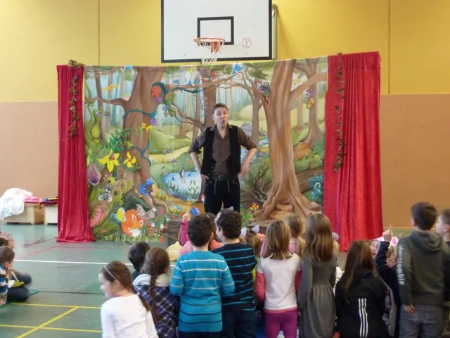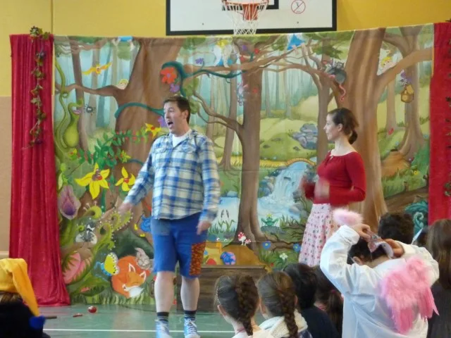 Gleich zu Beginn war der Einsatz von Lehrkräften gefragt. Frau van de Flierdt und Frau Hölzle übernahmen spontan und sehr überzeugend in je einer Aufführung die Rolle der Mutter. Text- und melodiesicher sangen die Kinder gemeinsam mit den Opernsängern die alten Kinderlieder “Suse, liebe Suse, was raschelt im Stroh?” und “Ein Männlein steht im Walde”. Sie hatten sie zuvor mit ihren Lehrkräften im Unterricht einstudiert. Ausgestattet mit Masken der Tiere des Waldes begleiteten sie Hänsel und Gretel in den Wald, verhalfen ihnen als Sandmännchen in den Schlaf und beschützten sie beim Abendsegen als Engel auf der Bühne. Schließlich halfen sie tatkräftig mit, die Hexe in den Ofen zu werfen und freuten sich mit den Opernsängern über das glückliche Ende. Die Kölner Opernkiste unter Leitung von Stefan Mosemann zauberte innerhalb von 70 Minuten eine märchenhafte Stimmung in unsere Turnhalle und beeindruckte Kinder und Lehrkräfte mit einer humorvollen Inszenierung, wunderschönen Stimmen und der Musik eines auf der ganzen Welt bekannten Komponisten, der in unserer Kreisstadt Siegburg geboren wurde und seine Kindheit dort verbrachte.