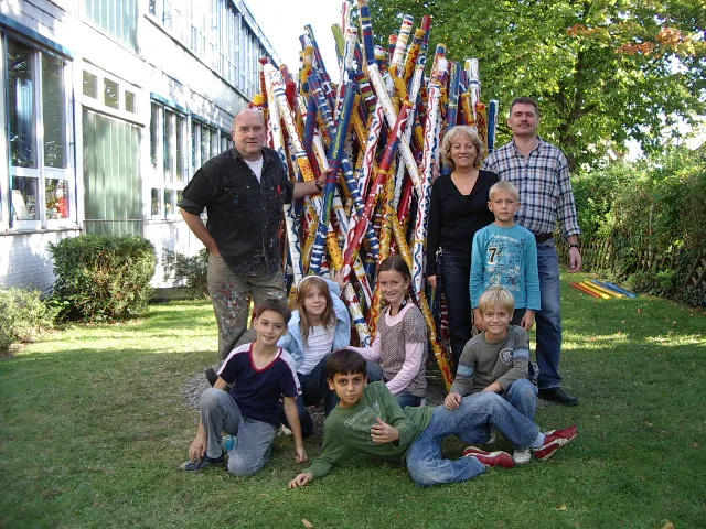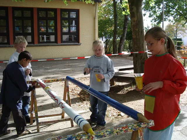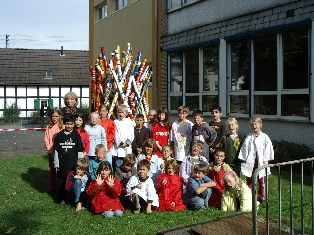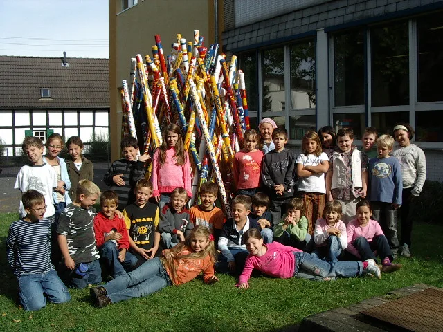 Am 19. und 20. September 2007 fand in unserer Schule die zweite Kunstaktion mit dem Künstler Fritz Pietz, Dülmen statt. 302 Schülerinnen und Schüler unserer Schule schufen gemeinsam mit Fritz Pietz in zwei Tagen eine Riesenbuntstiftskulptur, welche nun die Außenanlage der Schule schmückt. Hierfür brachte Herr Pietz insgesamt 151 jeweils 2,00 m lange Riesenholzbuntstifte mit, die er bereits rot, weiß, blau und gelb vorlackiert hatte. An zwei Vormittagen bemalten die Kinder aller Klassen immer zu zweit einen Riesenbuntstift. Fleißige Helfer aus den dritten und vierten Klassen unterstützten gemeinsam mit Hausmeister Frank Sagenschneider den Künstler am Nachmittag beim Aufbau der Skulptur. Gegen 18.00 Uhr des zweiten Tages war der letzte Riesenbuntstift fest verschraubt und das Kunstwerk fertig.