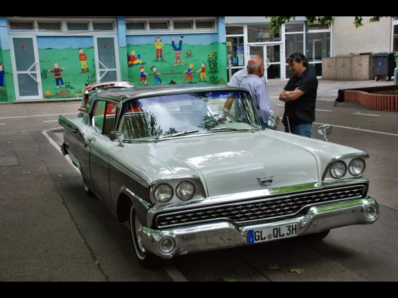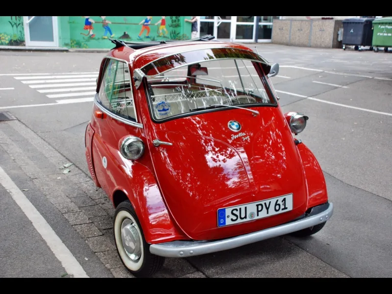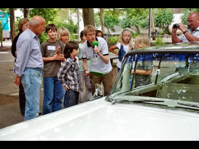 Auf dem Schulhof waren inzwischen drei Oldtimer aus den 50er Jahren vorgefahren. Sie gehören Mitgliedern des Niederkasseler Oldtimer-Clubs und wurden in der Sendung von den Kindern, die sich mit diesem Thema beschäftigt hatten, vorgestellt. Jeder durfte sich einmal in eine Isetta setzen. Sie wurde damals auch “Macht hoch die Tür” genannt, weil die Tür zum Einsteigen vorne am Auto war und sich samt Lenkrad von vorne öffnen ließ. Besonderes Aufsehen erzielten jedoch zwei schnittige Cabrios.