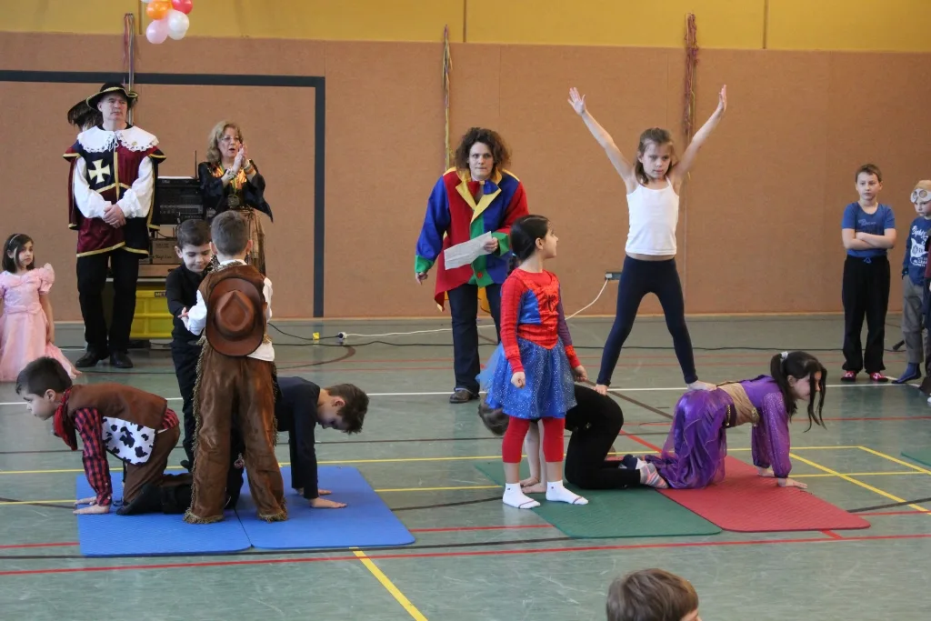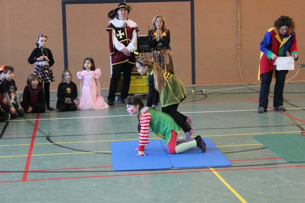 Im Anschluss traten erstmals Tanzgruppen von Blau-Gelb Niederkassel auf, die die Kinder ebenfalls mit ihren Tänzen begeistern konnten. Ihren festen Stammplatz hat die Tanzgarde von Grün-Gelb Niederkassel, die auch in diesem Jahr mit ihren zahlreichen Tanzgruppen vertreten war. Den Abschluss der von Frau Grommes geleiteten Karnevalsfeier bildeten die Klassen 2a, 2c und 4c, die die Kinder mit Witzen und einer Akrobatikshow unterhielten. Abschließend verabschiedeten die Lehrerinnen und Lehrer ihre Schüler in die tollen Tage.