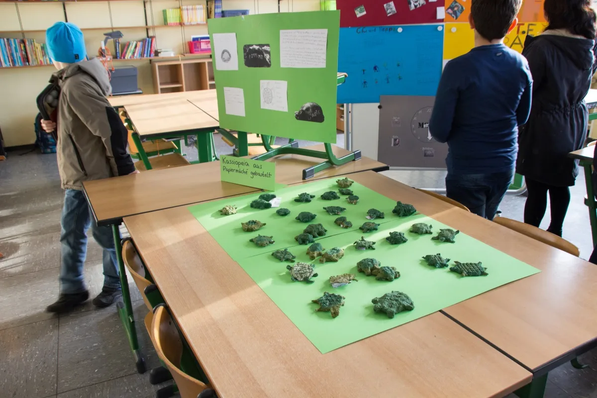 Die Kinder zeigten bei der künstlerisch-kreativen Auseinandersetzung mit den Werken Endes großen Ideenreichtum. Davon konnten sich dann auch interessierte Besucher im Rahmen des Präsentationsnachmittags überzeugen. In den Klassenräumen waren Kunstwerke aufgebaut, Quizspiele luden zum Mitmachen ein oder eine Ausstellung konnte mittels selbst erstelltem Audio-Guide besucht werden. Frau Quiske hat mir ihrer Klasse sogar ein kleines Theaterstück eingeübt. Die Michael-Ende-Ausstellung, die uns durch den Leseratten-Service zur Verfügung gestellt wurde, komplettierte das Angebot. In der Mensa stand Kaffee und Kuchen bereit, der dank zahlreicher Spenden kostenlos angeboten werden konnte. Allen Spendern sei an dieser Stelle herzlich gedankt!