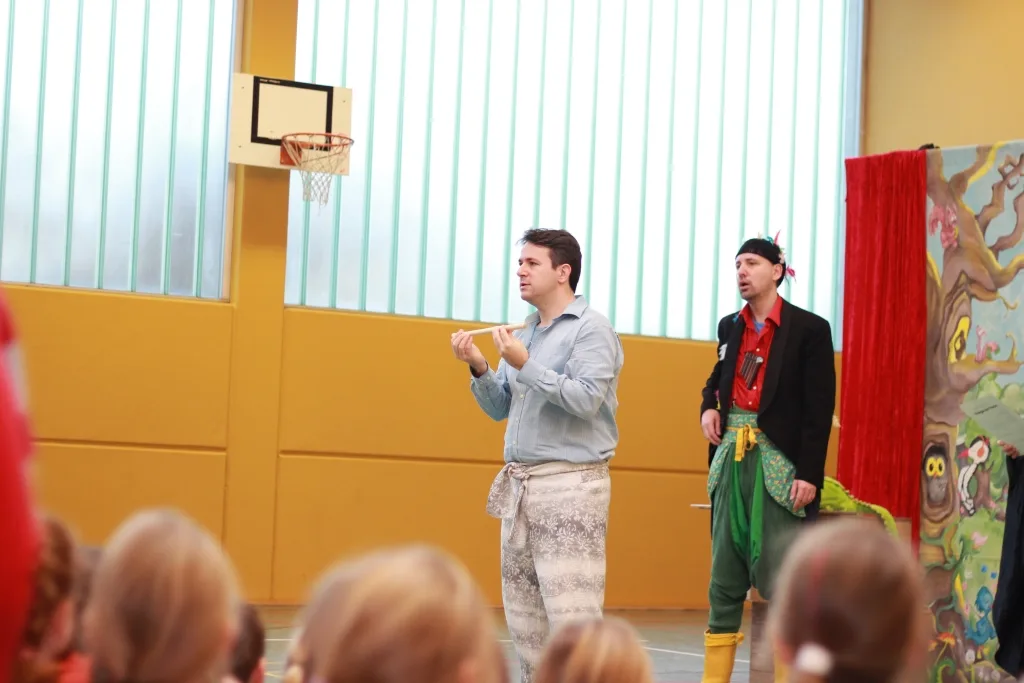 Schon im Vorfeld beschäftigten sich die Kinder im Musikunterricht intensiv mit dem Stück, ehe es dann am 19.1.2015 in der Turnhalle zu einer Aufführung mit ausgebildeten Opernsängern ging. Zu Beginn führte Mosemann die Kinder unter tatkräftiger Unterstützung der “Riesenschlange” in die Welt der Oper ein, ehe er dann gemeinsam mit Christine Lea Meier und Antonio Rivera ausgewählte Arien zum Besten gab. Doch auch einige Kinder und Lehrkräfte unterstützten die Profis bei der Aufführung, in dem sie spontan einen kleinen Part in der Oper übernahmen. Gemeinsam konnte dann Papageno und Tamino ans Ziel gebracht werden.
