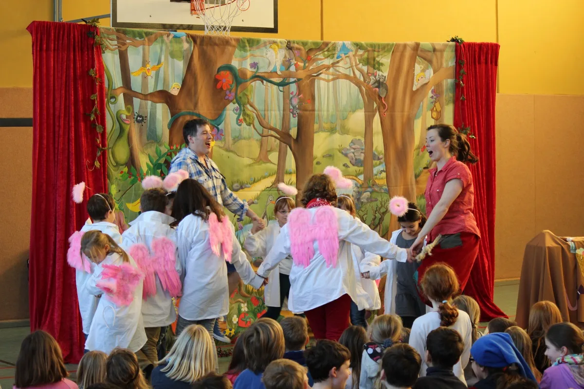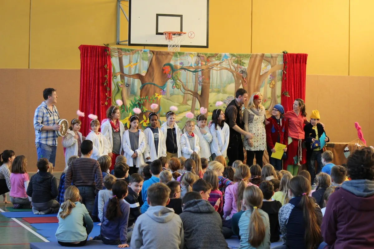 Die gut 290 Schülerinnen und Schüler folgten mit Begeisterung der Darbietung der drei Schauspieler, die sich zuvor noch ausreichende Unterstützung durch mitwirkende Kinder und Lehrkräfte sicherten. In der gut 60 Minuten dauernden Vorführung wurden die Kinder nicht nur die grundlegenden Begriffe einer Oper eingeführt, sondern vor allem auch in den aufregenden Wald mit all seinen Geheimnissen entführt. Bis zuletzt, als die böse Hexe endlich im Ofen schmorte, folgten die Kinder dem Schauspiel mit großer Anspannung und viel Freude. Für alle Beteiligten war der Auftritt der Kölner Opernkiste auch in diesem Jahr ein voller Erfolg.