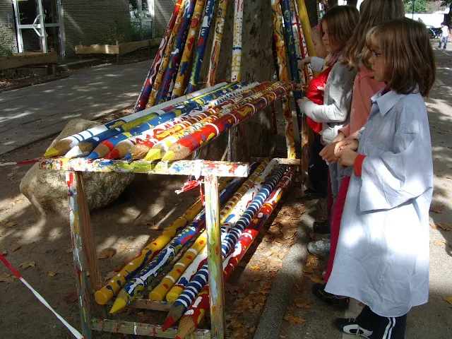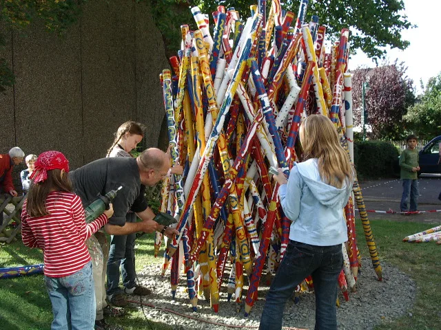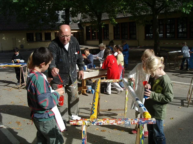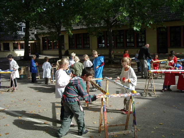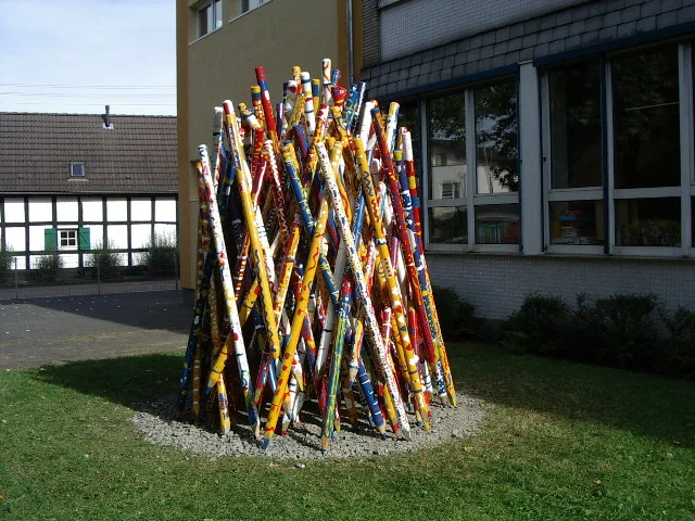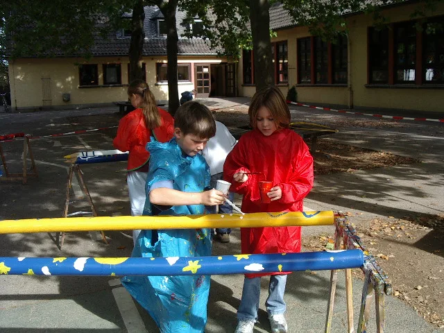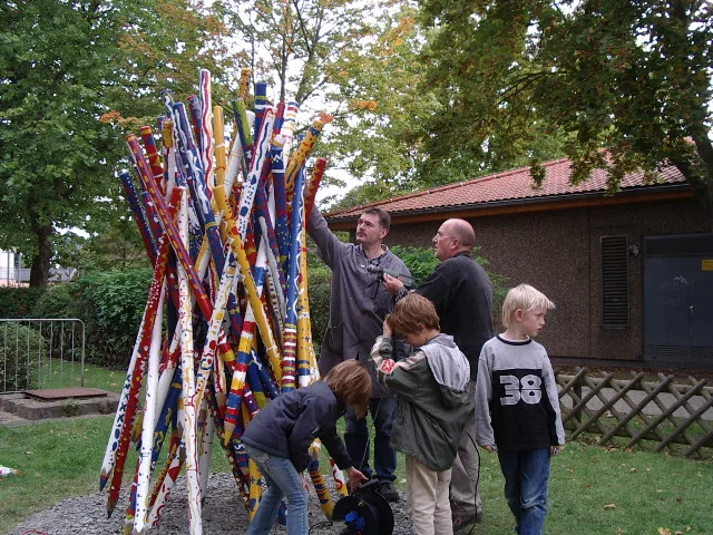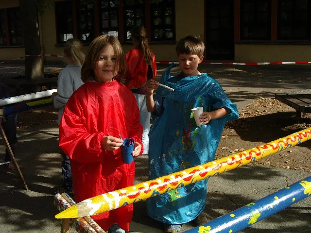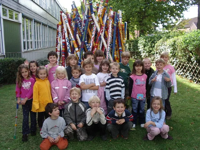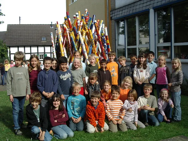 Am 19. und 20. September 2007 fand in unserer Schule die zweite Kunstaktion mit dem Künstler Fritz Pietz, Dülmen statt. 302 Schülerinnen und Schüler unserer Schule schufen gemeinsam mit Fritz Pietz in zwei Tagen eine Riesenbuntstiftskulptur, welche nun die Außenanlage der Schule schmückt. Hierfür brachte Herr Pietz insgesamt 151 jeweils 2,00 m lange Riesenholzbuntstifte mit, die er bereits rot, weiß, blau und gelb vorlackiert hatte. An zwei Vormittagen bemalten die Kinder aller Klassen immer zu zweit einen Riesenbuntstift. Fleißige Helfer aus den dritten und vierten Klassen unterstützten gemeinsam mit Hausmeister Frank Sagenschneider den Künstler am Nachmittag beim Aufbau der Skulptur. Gegen 18.00 Uhr des zweiten Tages war der letzte Riesenbuntstift fest verschraubt und das Kunstwerk fertig.