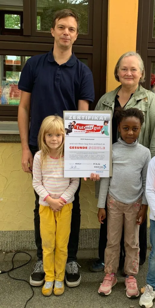 Zwei Highlights warteten auf dem Schulhof auf die Kinder: Nach der großen Pause bekam die KGS Niederkassel für Ihre konsequente Umsetzung der Tutmirgut-Bausteine erneut das Tutmirgut-Zertifikat verliehen. Frau Vajler-Schulze von der Diakonie an Rhein und Sieg überreichte dem stellvertretenden Schulleiter Florian Emrich die Auszeichnung. Somit ist die KGS Niederkassel auch in den kommenden 3 Jahren eine Tutmirgut-Schule. Zum Abschluss der kleinen Zeremonie tanzten alle Kinder gemeinsam mit ihren Lehrerinnen einen Bewegungstanz.