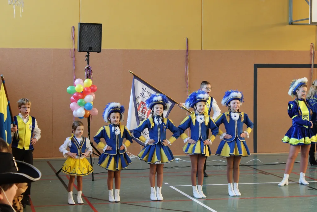 Im Anschluss traten erstmals Tanzgruppen von Blau-Gelb Niederkassel auf, die die Kinder ebenfalls mit ihren Tänzen begeistern konnten. Ihren festen Stammplatz hat die Tanzgarde von Grün-Gelb Niederkassel, die auch in diesem Jahr mit ihren zahlreichen Tanzgruppen vertreten war. Den Abschluss der von Frau Grommes geleiteten Karnevalsfeier bildeten die Klassen 2a, 2c und 4c, die die Kinder mit Witzen und einer Akrobatikshow unterhielten. Abschließend verabschiedeten die Lehrerinnen und Lehrer ihre Schüler in die tollen Tage.